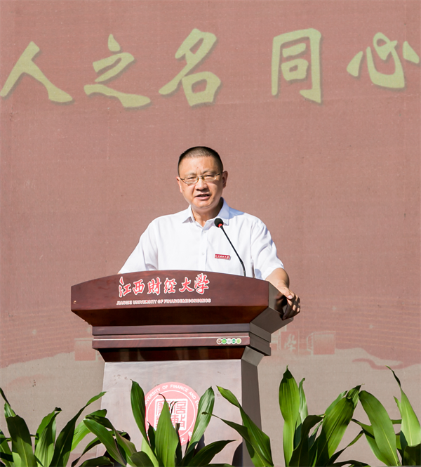 百年来,江财人自强不息、艰苦奋斗,秉承“信敏廉毅”校训和“敬业乐群、臻于至善”大学精神,培养了30余万名各类优秀人才,为国家和地方经济建设、社会发展作出了积极贡献。刘耀彬指出,同学们走进了江财的校园,江财同样也进入了同学们的人生,大家就拥有了一个共同的名字——“江财人”。江财,愿做你们成长道路上的同行者与摆渡人,既给你们向下扎根的底气,也给你们向上高飞的勇气。江财能给你:精神传承与奋斗指引,涵养矢志向前的人生力量。江财能给你:包容平台与成长沃土,绽放多元青春的独特光彩。江财能给你:家国情怀与责任使命,塑造心怀大我的时代品格。
