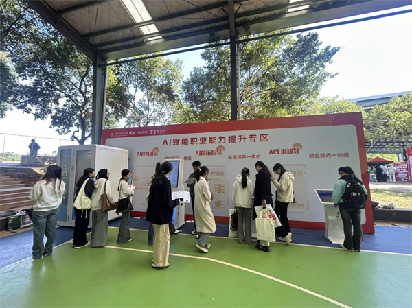 招聘会现场气氛热烈高涨,除了优质企业展位前的火爆咨询场景,由·就业桥提供的四台AI智能就业服务设备组成的“AI赋能职业能力提升专区”同样成为焦点。