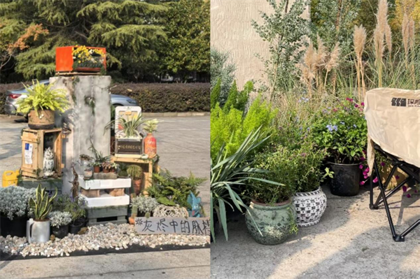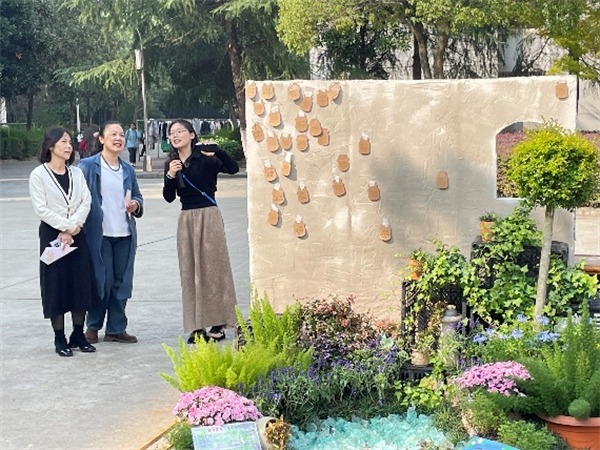 在展览现场,8组作品各有巧思,成为校园里一道独特的“生态风景线”。其中,以“都市疗愈”为主题的作品《陶语森境,疗愈绿洲》,参考英国自然式风景画的风格,通过兰花鼠尾草、孟娜薰衣草、蓝雪花等疗愈植物搭配浅色系陶罐,营造出静谧舒缓的氛围,模拟都市人在快节奏生活中渴望的“疗愈角落”。