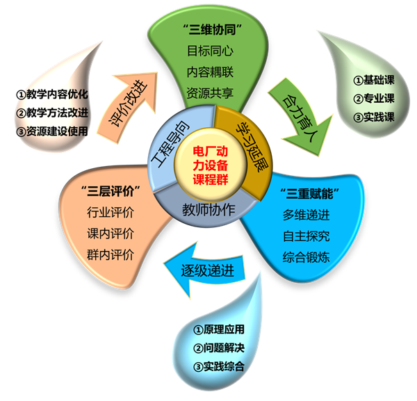 江西水利电力大学能源与动力工程专业教师团队面向我国电力供给侧结构调整与技术升级背景,针对人才培养中存在的电厂动力设备专业课程群合力育人效果不明显、学生工程能力培养不足、课程评价方法单一等较突出的问题,基于我国电力生产行业结构优化调整新局面,聚焦发电特色动力设备课程群教学改革,以“目标同心、内容耦联、资源共享”为课程群建设理念,以一流课程建设为契机,以内容重构、方法革新、教学评价为抓手,创新形成了“三维协同、三重赋能、三层评价”电厂动力设备课程群教学新模式。