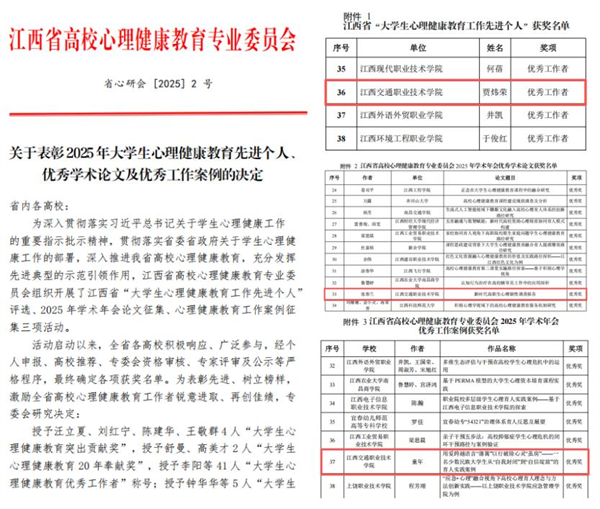 近日,江西交通职业技术学院心理健康教育工作喜讯连连,师生在两项省级评选与赛事中斩获多项荣誉。在江西省高校心理健康教育专业委员会公布的2025年评选结果中,教师贾炜荣获评全省“大学生心理健康教育优秀工作者”,教师张春兰、童年分别撰写的学术论文与工作案例获优秀奖。在江西省社会心理学会主办的2025年“心泊赣鄱”心理健康科普短视频创作大赛中,学院师生团队获一等奖2项、二等奖4项、三等奖6项。