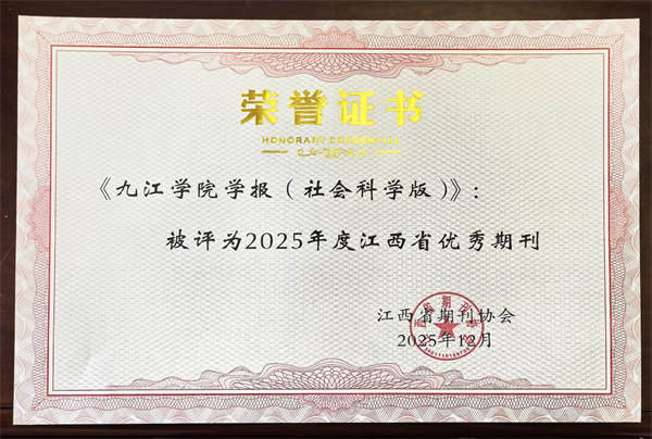 近日,江西省期刊协会公布2025年度全省期刊评优结果,《九江学院学报》(社会科学版)荣获“江西省2025年度优秀期刊”称号。该评选每四年举办一次,重点考察期刊的政治导向、学术价值、编校质量、出版规范及社会影响力等维度。此前,该学报已多次被评为“全国高校优秀期刊”“江西省优秀期刊”。