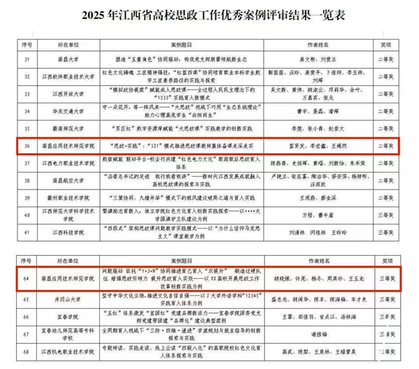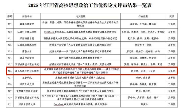 此次在2025年度江西高校思想政治工作优秀论文和优秀案例评选中荣获佳绩,既是对学校思政育人实践成效的有力印证,也为我们今后的工作注入了新的动力。学校将始终坚守“立德树人”初心,持续推动特色思政课内涵式发展,着力提升思想政治教育的时代性、针对性与亲和力,矢志培养兼具责任担当、创新精神与人文素养的新时代青年,为服务国家战略需求和民族复兴伟业贡献更坚实的教育力量。(来源:南昌应用技术师范学院; 作者:周其珍)