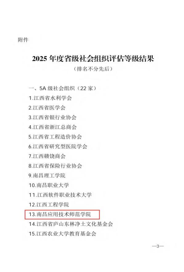 近日,江西省民政厅公布2025年度省本级社会组织等级评估结果,南昌应用技术师范学院首次获评最高等级——5A级社会组织。