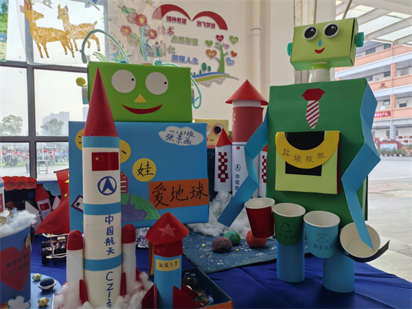 各年级围绕主题开展特色筹备活动。一二年级学生化身“环保小创客”,用纸箱、瓶盖等废旧材料打造简易机器人、火箭模型等科技小作品;三四年级学生聚焦身边科技产品,通过图文结合的方式完成调查报告,细致记录智能手表、扫地机器人等产品的功能与价值;五六年级学子则以“大国重器·手绘守护”为主题,查阅权威资料精准绘制航母、隐形战机等国防科技成果,标注关键技术参数与国防意义,尽显家国情怀与科学素养。这些作品在活动当天于校园门厅分区展出,成为一道亮眼的科技风景线。