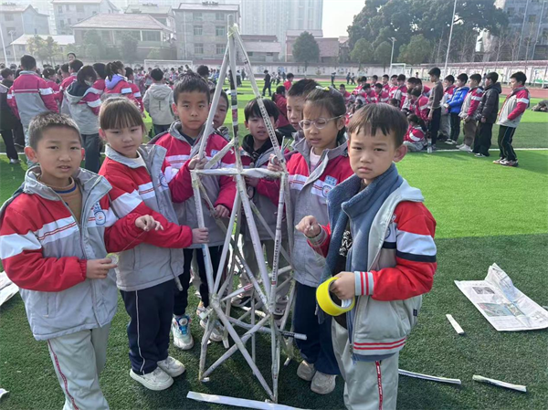 活动当天,现场赛事精彩纷呈,不同年级按时段有序开展个人赛与团体赛。一二年级的小选手们在篮球场参与纸杯叠叠乐、纸飞机精准投靶、静电小猫钓鱼等趣味挑战,在欢声笑语中感受科学原理的奇妙;“环保积木城”“吸管穹顶搭建”等团体项目,使低龄学子在协作中体验创造的乐趣。三至六年级的赛场同样热闹非凡,足球场与国旗广场上,“报纸城墙承重”“简易缆车制作”“太阳能小车竞速”“防灾小屋设计”等进阶项目轮番上演。学生们分组协作,从图纸设计到现场搭建,从原理探究到问题解决,充分展现了扎实的科学知识与出色的实践能力。