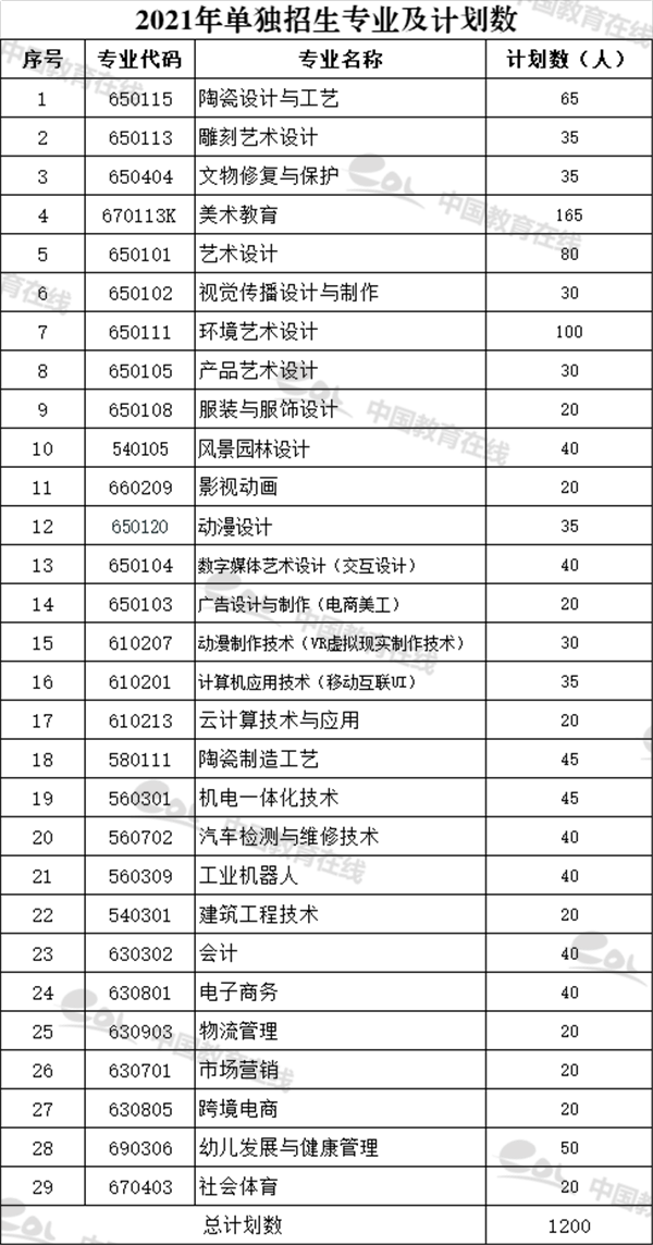讯 近日,江西省教育厅发布《关于做好江西省2021年普通高校专项计划招生工作的通知》,对今年江西省高职单招工作进行了安排。根据要求,各单招院校要根据自身办学定位和培养目标,制定本校2021年单独考试招生简章。以下是江西陶瓷工艺美术职业技术学院2021年单独招生简章。