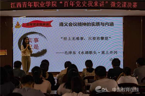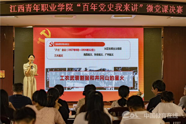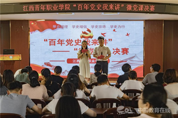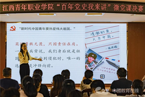 讯 为进一步深化党史学习教育,提升党史学习教育的吸引力、感染力和影响力,推动党史学习有声有色、入脑入心。江西青年职业学院开展“百年党史我来讲”“微党课”大赛,全面提升党员讲党课质量。江西青年职业学院举行“百年党史我来讲”“微党课”决赛,全体党员参加了本次活动。