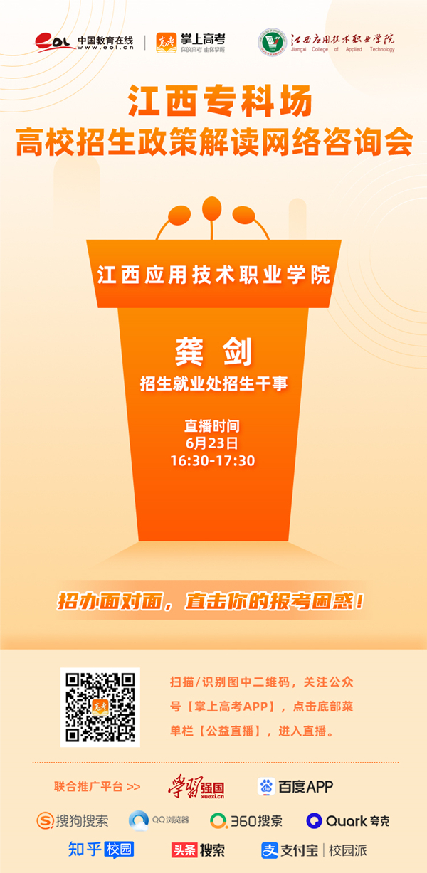 只要你关心的,我们统统来解答!为帮助大家准确、全面地了解我校2021年招生政策,6月23日16:30-17:30,我校招生老师将走进直播间,为各位考生及家长分享我校2021年招生录取政策新变化、专业报考要求、志愿填报注意事项等内容,一定不要错过!