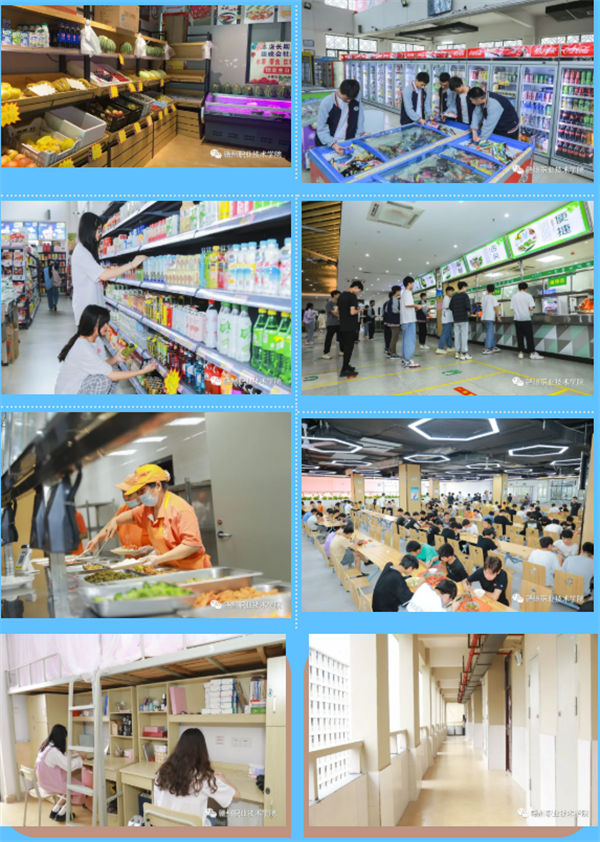 学院建有全国领先的智慧校园系统,5G校园网络全覆盖,学习、生活、购物实行一卡通,带你享受智能服务带来的便捷。现建有学生食堂2栋,能同时容纳上万人用餐,菜品丰富、物美价廉;学生宿舍9栋,每间4至6人,配有空调,24小时热水供应,采用卫生间、洗澡间、洗漱间独立设置,居住舒适、功能齐全。校内还建有各类超市便利店及小吃街,物品丰富、价格实惠,能够最大限度满足学子在校的学习及生活需要。