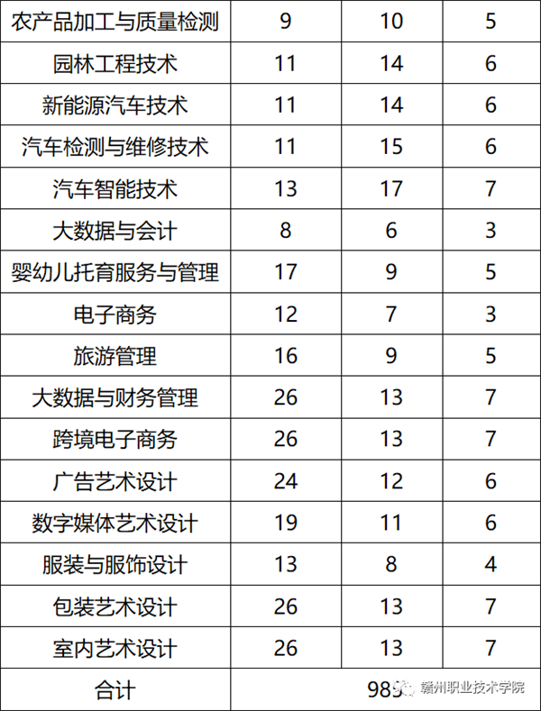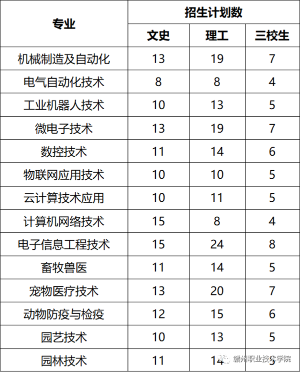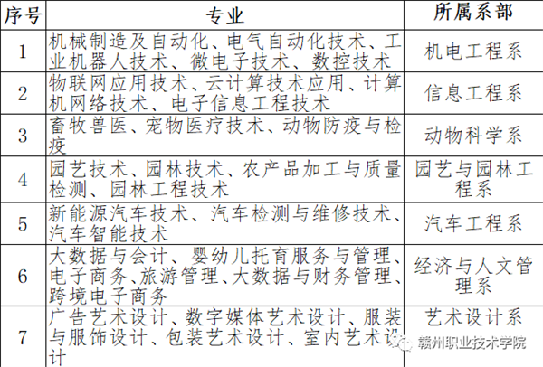 学院紧紧围绕服务赣州地方经济发展,以市场需求为导向,现开设有8大院系30个专业,专业覆盖齐全,根据新能源科技城建设项目,开设了新能源汽车技术、机械制造及自动化等专业;根据现代家居城建设项目,开设了物联网应用技术、云计算技术应用等专业;在服务现代农业和服务业等方面,开设了园艺技术、畜牧兽医、农产品加工与质量检测等专业。