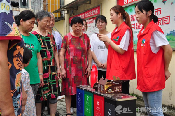 “学子进社区”文明实践服务队走近南昌市西湖区西湖街道上谕亭社区。实践团队为社区居民进行垃圾分类志愿讲解,把社区杂物堆积处、绿化带以及难以清理的地方统一进行了清扫。倡导居民垃圾分类,树立环保理念。