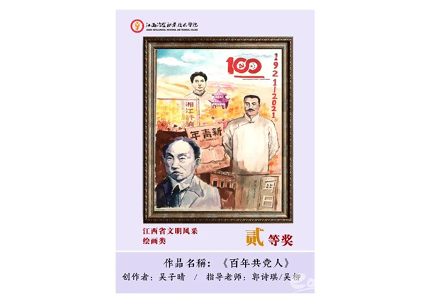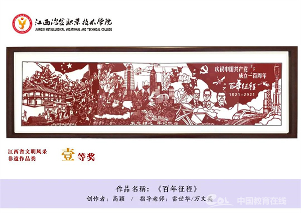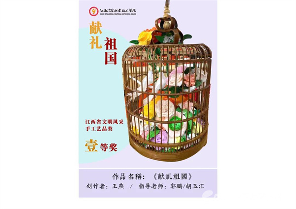 讯 近日获悉,在江西省组织开展的中等职业学校“少年工匠心向党 青春奋进新时代”主题教育活动中,江西冶金职业技术学院荣获多个奖项,其中《献礼祖国》荣获手工艺组一等奖、《百年征程》荣获非遗组一等奖,《素生》和《百年共产人》荣获绘画组二等奖。