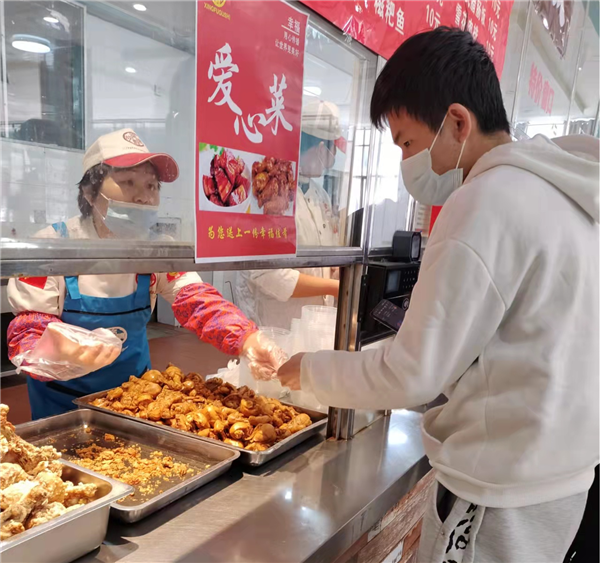 “免费爱心菜品活动太棒了,让大家在倒春寒的季节里感到温暖和贴心,感谢食堂叔叔阿姨们的辛勤付出,食堂菜品丰富,我感到很幸福,为冶金学院点赞!”20级冶金一班曾志进同学兴奋地说。