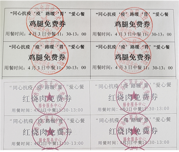 为缓解学生在疫情期间的念家之情,体现学校人文关怀,积极发挥服务育人功能,助力学校疫情防控工作,共同筑起抗疫屏障。学校膳食服务中心根据在校师生人数每人发放爱心免费餐券两张,师生可凭餐券到任一食堂免费领取爱心餐一份。