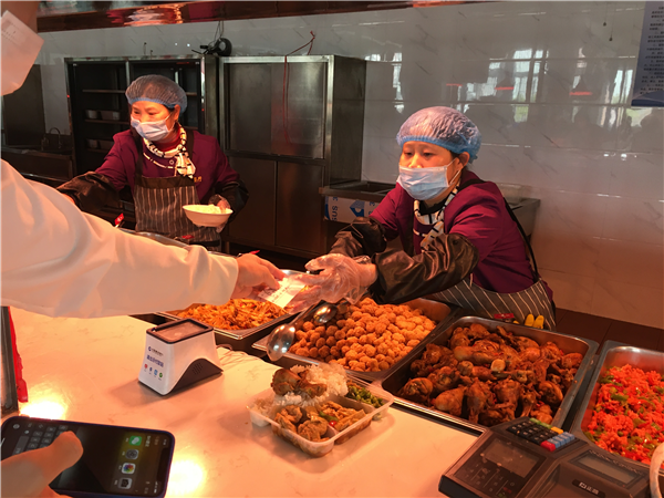 在食堂,同学们手持用餐券,将餐券交给食堂工作人员,便可免费获得一份“同心抗疫 ‘疫’ 路暖胃”爱心餐。