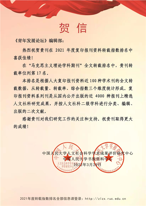 日前,中国人民大学人文社会科学学术成果评价研究中心和中国人民大学书报资料中心正式发布了2021年度复印报刊资料转载指数排名。2021年,江西青年职业学院《青年发展论坛》杂志共有7篇文章被人大复印报刊资料全文转载,在2021年度复印报刊资料“马克思主义理论学科期刊”全文转载排名中,转载率位列第17位。