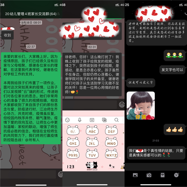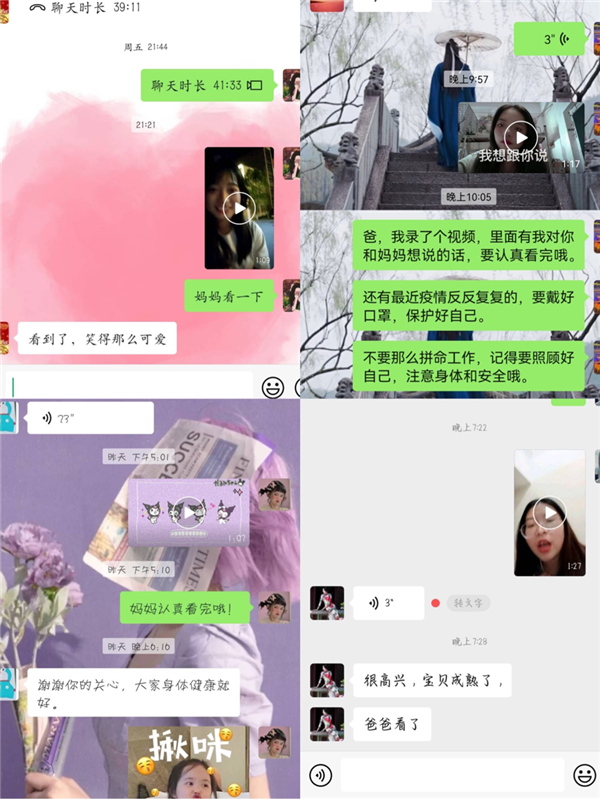 家长们收到孩子一段段暖心视频后热泪盈眶,感动至极。在与辅导员徐卉的通话过程中表示:“疫情之下,突然收到孩子的视频,是感动,是思念亦是心安。孩子虽然不在身边,但却仍然心连着心,谢谢学院对孩子的关怀备至,谢谢老师们对孩子从生活到学习无微不至的关怀。”