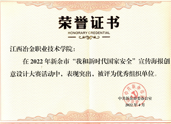 4月11日,由市委办、市委国安办联合主办的2022年“我和新时代国家安全”宣传教育大赛颁奖典礼在新余市仙来湖公园举行,江西冶金职业技术学院荣获海报类优秀组织奖,短视频类荣获一等奖一个,优秀传播奖一个,海报类荣获优秀奖一个。