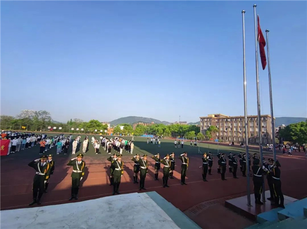 学校国旗护卫队迈着整齐矫健的步伐走向升旗台,伴随着庄严肃穆的《义勇军进行曲》,五星红旗迎着朝阳冉冉升起,全体师生肃立,行注目礼,大家齐声朗读了《国家安全法》。(供稿:江西冶金职业技术学院 喻嘉倩)