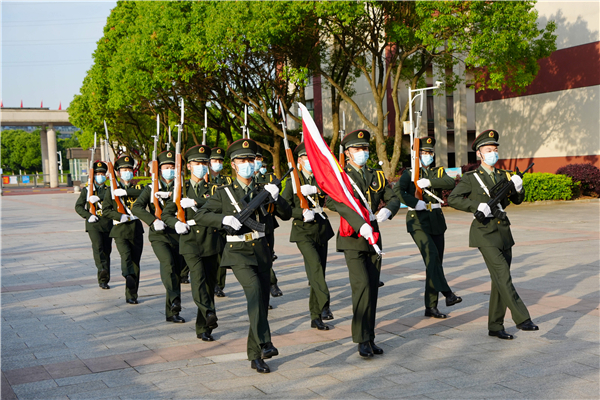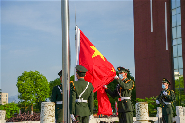 上午7时整,升国旗仪式正式开始。学院国旗护卫队迈着整齐划一、铿锵有力的步伐护送国旗来到升旗台前,伴随着激昂雄壮的《义勇军进行曲》,鲜艳的五星红旗冉冉升起,在晨风中高高飘扬。全体师生向国旗行注目礼,并自豪地高唱国歌。