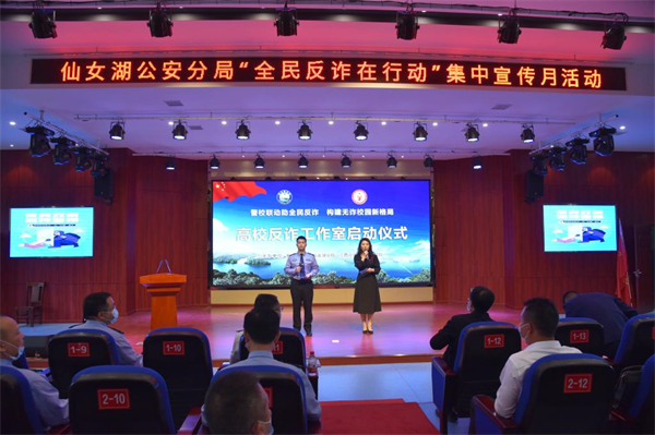 5月20日,在江西冶金职业技术学院报告大厅,学校与新余市仙女湖区公安分局举行仪式,为共建的“高校反诈工作室”揭牌,同时进行了反诈宣传汇演。据悉,这是全市高校的第一个反诈工作室。新余市公安局副局长袁军,市局刑警支队政委刘兵芽、支队支委委员潘水泉,仙女湖区公安分局局长张海珠、政委邹小刚及相关部门负责人出席了揭牌仪式。学校领导杨乐文、郭志江、谢向莹、谢翀、潘山及师生代表150余人参加本次活动。