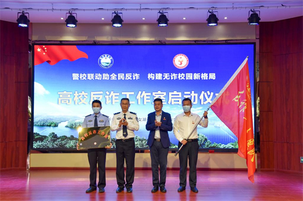 仪式上,袁军为“高校反诈工作室”揭牌;郭志江为学校反诈先锋志愿服务队授旗。