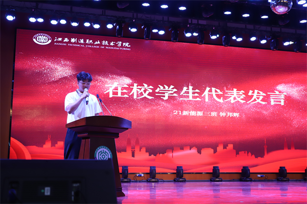 在校学生代表21新能源3班 钟邦辉表达了对学长学姐的感谢和祝福,并表示将接过属于制造人的接力棒,续写制造的辉煌,认真踏实、勤劳刻苦、脚踏实地,以优异成绩为母校的发展贡献我们的青春和力量。