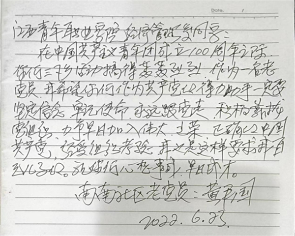黄国平爷爷见到实践队队员的第一句话就是“你们这群年轻娃娃有没有提交入党申请书呀?”听见队员们回答“提交了”,他欣慰地缓缓道出他自己的入党经历。黄老20岁便提交了入党申请书,但由于工作原因,他多次调换工作单位和岗位,每更换一次工作黄老就得重新提交一份入党申请书,重新接受党组织的考验,前前后后考验了十多年才终于在中国共产党成立66周年之际成功加入党组织。黄老说道:“虽然过程坎坷,但从来没想过放弃加入中国共产党,入党是我坚如磐石的信念。”如今,黄老入党34年了,他十分自豪并期待自己有幸能够在入党50周年获得一枚纪念勋章。
