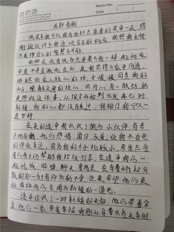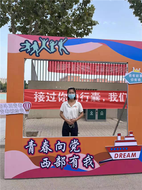 从看见招募西部志愿者通知的那一刻起,我已在心中默默下定决心,经过层层选拔到最后确定,我丝毫没有犹豫和动摇。起初家中父母不放心我一个女孩子去到离家那么远的地方,我告诉他们有千千万万个青年大学生,和我一样,扎根西部服务基层,把青春之花绽放在西部热土上,他们被我的坚持所打动,非常支持与尊重我的选择,于是把他们的爱和不舍都化作满满当当的家乡美食塞进了我的行囊。系部主任戴彩云老师反复叮嘱我要多注意安全,希望我能学以致用,服务西部,不负青春、不负使命。我想对所有关心和爱护我的人说一声“感谢你们的支持与理解,我只是做了自己想做的事和该做的事。”