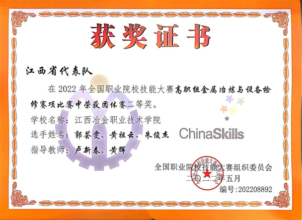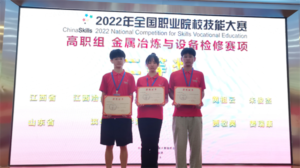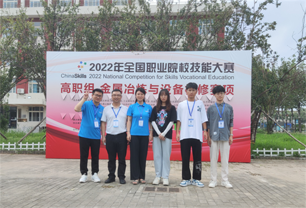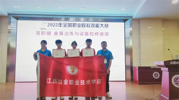 8月20日,2022年全国职业院校技能大赛“金属冶炼与设备检修”赛项(高职组)在天津工业职业学院圆满落幕,由江西冶金职业技术学院万美茜(领队)、卢新春(指导老师)、黄辉(指导老师)组成教师团队,郭荟雯、朱俊杰、黄祖云三名学生组成选手团队,代表江西省队参加比赛,以优异成绩荣获项目国赛二等奖(全国第5名)。