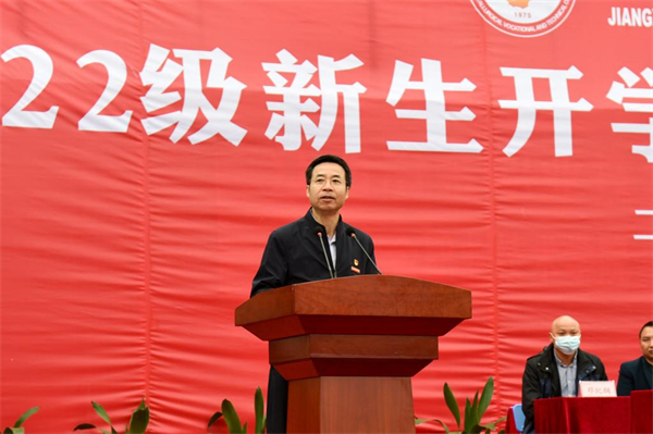 党委副书记、院长郭志江致辞。他向同学们提出两个问题:为什么选择江冶?在江冶如何度过?和同学们探讨了冶院发展的未来:随着办学实力的不断提升,冶院的录取分数线和社会评价越来越高,师资队伍、就业升学越来越好。在这样的环境中,同学们要珍惜时光,加倍努力。为此他向新生提出两点要求:一、希望立德修身。树立“爱党报国、敬业奉献、服务人民”的人生理想,成为建设社会主义现代化强国,实现中华民族伟大复兴的中坚力量。二、希望脚踏实地。在勤学苦练中提高本领、学会担当。