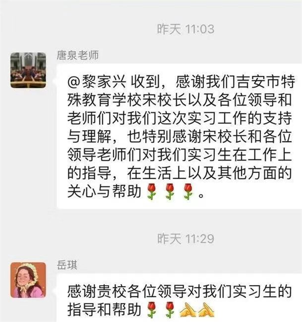 会后,赣州师专驻吉安市特殊教育学校实习指导老师唐泉老师表示“感谢我们吉安市特殊教育学校宋校长以及各位领导和老师们对我们这次实习工作的支持与理解,也特别感谢宋校长和各位领导老师们对我们实习生在工作上的指导,在生活上以及其他方面的关心与帮助。”2022届特殊教育实习生班主任岳琪老师表示“感谢贵校各位领导对我们实习生的指导和帮助。让我校实习生在疫情复杂的当下,得到了成长,提高了今后的教学能力。”