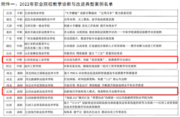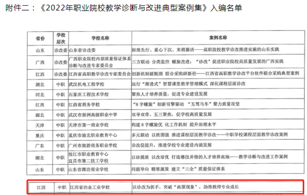 近日,从教育部中国教育科学研究院传来好消息:江西冶金职业技术学院2个案例入选全国教学诊改典型案例。这两个案例为:《以诊改为抓手,突破‘高原现象’,助力教师专业成长》《创新现代学徒制育人模式,推进特色专业教学诊改》。其中《以诊改为抓手,突破‘高原现象’,助力教师专业成长》还入选《2022年全国职业院校教学诊断与改进典型案例集》。