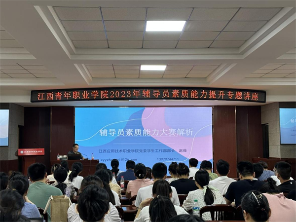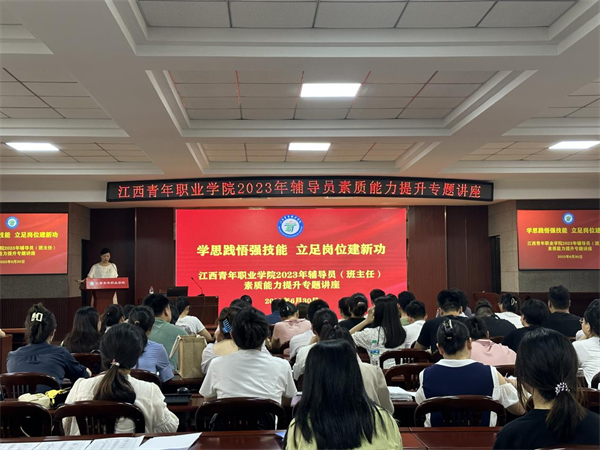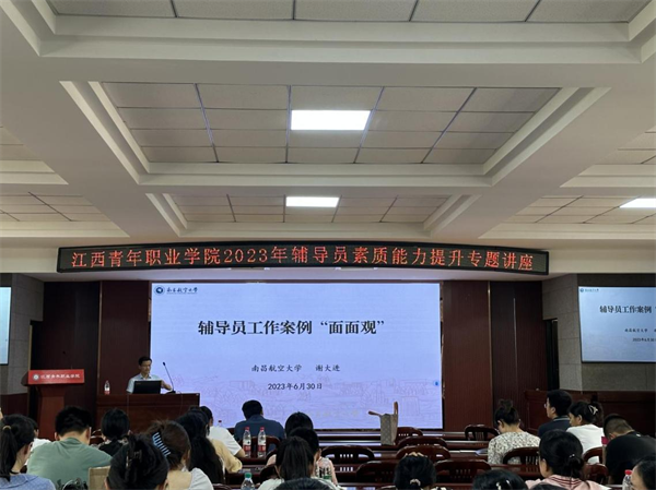 为深入学习贯彻习近平新时代中国特色社会主义思想,落实立德树人根本任务,进一步提升辅导员素质能力,打造一支政治强、业务精、纪律严、作风正的辅导员队伍,近日,江西青年职业学院在多功能厅举办2023年辅导员素质能力提升专题讲座,特邀南昌航空大学信息工程学院党委副书记、副院长谢大进,及江西应用职业技术学院学工处处长赵薇作专题讲座,全校辅导员班主任参加。学校党委委员、学工部部长刘小莲主持讲座。