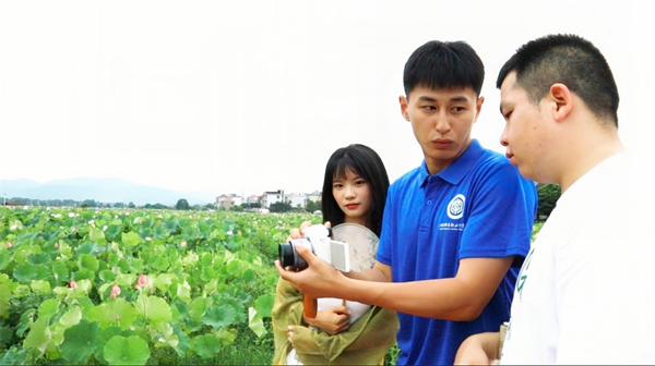 在莲花县荷花博览园开展新媒体支农,为莲花县的荷花产业制作海报、视频和推文等网络文化产品,并在现场为前来旅游赏花的游客指导拍摄技巧。“要拍莲花为背景的照片,建议您可以把角度稍微调低一点”“把人物放在画面的三分之一处,人与莲花会更加相得益彰。”实践队员正在用自己在学校团委新媒体中心的工作中学到的知识,帮助游客拍出更出彩的旅游照。