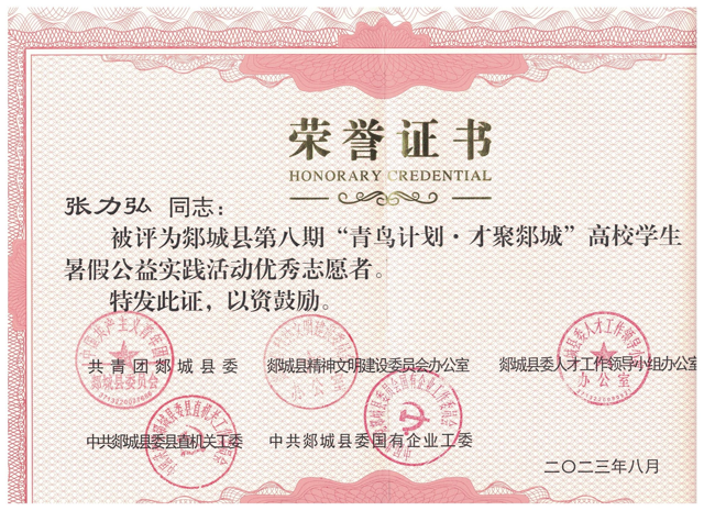2023年的夏天,张力弘同学响应家乡号召,积极投入到家乡大学生实践活动中。张力弘同学虽不是党员,但作为一名积极向党组织靠拢的入党积极分子,他在实践活动中始终以党员的标准要求自己。他参加了“青鸟计划·才聚郯城”高校学生公益实践活动,每天向郯城当地居民发放《沂河保护法》宣传单和环保手册并介绍该法律制定的目的和意义并进行一对一讲解。为了锻炼自己的文字归纳能力,更好地服务大家,他申请每天晚上去街道办帮忙处理一些文字材料。张力弘同学还参加了青年志愿者助力乡村振兴“周末青年志愿服务日”活动,加入社区清扫志愿服务活动。此外,他为了能够深入基层、扎根基层,投身乡村振兴一线,他还参加了共青团郯城县委举办的“助力乡村振兴”志愿服务活动,每天和生产线上的工人师傅们一起工作,在生产线上践行“工匠精神”“劳动精神”。