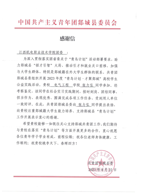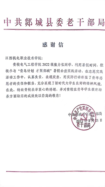 “党建育人1对N”模式,“1”指的是大学生入党积极分子这样一个在学生群体中发挥表率作用的群体,“N”代表的是学院众多青年学生。电气工程学院党总支把入党积极分子排头兵作为培养重点,在学生群体中形成育人辐射力。暑假期间,学院大学生入党积极分子——2022级机电设备技术专业张力弘同学积极参加家乡多个志愿服务,他所展现出的踏实的工作作风、认真负责的工作态度获得当地共青团、精神文明办等有关部门的高度认可,获评了郯城县第八期“青鸟计划·才聚郯城”高校学生暑期公益实践活动优秀志愿者。