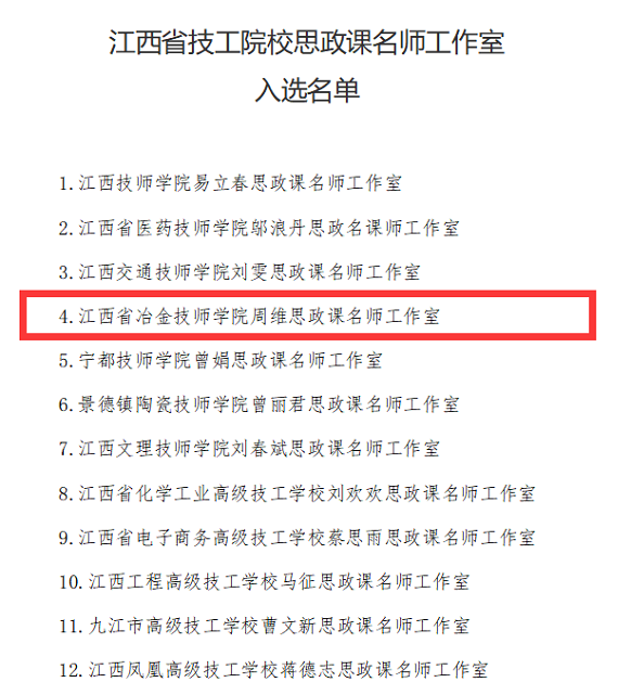 日前,江西省人力资源和社会保障厅公示《江西省技工院校思政课名师工作室入选名单》,江西冶金职院思政部“周维思政课名师工作室”成功入选。