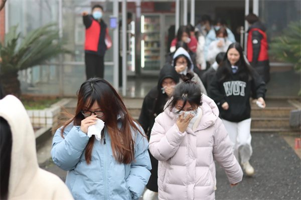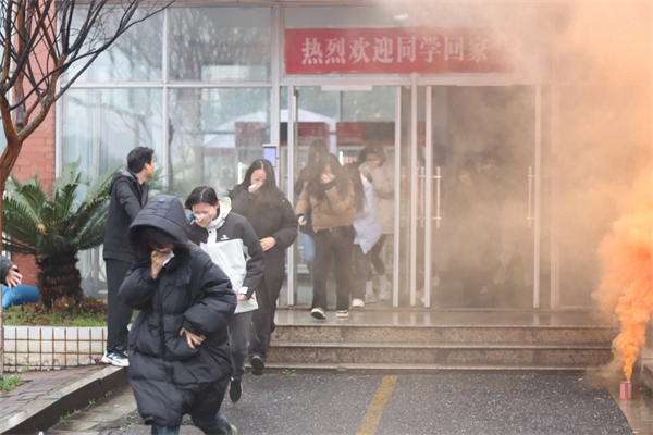 演练活动根据学校各宿舍楼栋分布情况,共分6批次展开。活动现场,随着警报声拉响,各放烟点浓烟升起。师生们迅速反应,用湿毛巾捂住口鼻、弯腰低头,按照预定的路线有序撤离到指定安全位置。