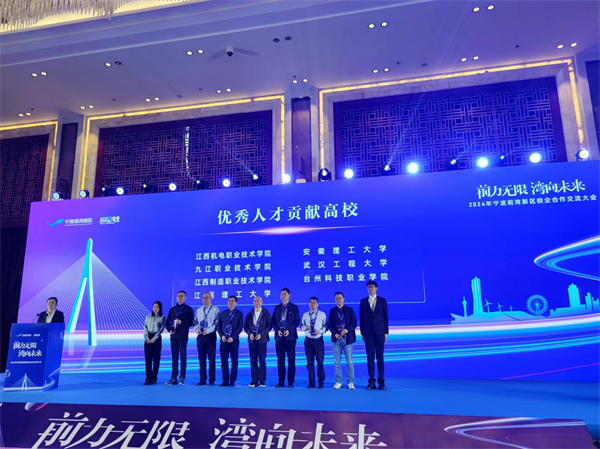 随后,聂林水带队前往宁波市前湾新区参加“前力无限 湾向未来”2024年区校企合作交流大会。在大会开幕仪式上,江西制造职业技术学院被前湾新区管委会授予“优秀人才贡献高校”。近年来,江西制造职业技术学院与前湾新区合作密切,尤其在顶岗实习、订单合作、工学交替等模式方面取得丰硕成果,输送技能人才数量位居各高校前列。