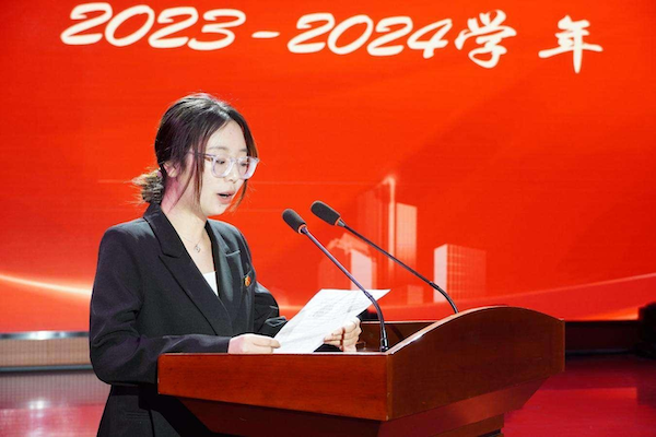 大会伊始,全体与会人员集中学习了习近平总书记五四青年节对广大青年寄语精神。随后进行了第34期业余团校结业典礼、第十一期大骨干培训班开班仪式和2023-2024学年“两红两优”表彰等环节。各学生代表依次上台发言,22国贸1班刘碧瑶表示,将充分发扬共青团优良传统,进一步增强“四个意识”,继续发挥团员的模范带头作用;23数媒8班葛雨田表示,作为大骨班学员,要坚定理想信念,坚持知行合一,争当先锋模范,做好马克思主义的拥护者、实践者和传播者;23工设1班杨如玉鼓励全体团员以团歌为号召、以团旗为标杆、以团徽为荣耀,在平凡中见伟大,在积累中求理想。