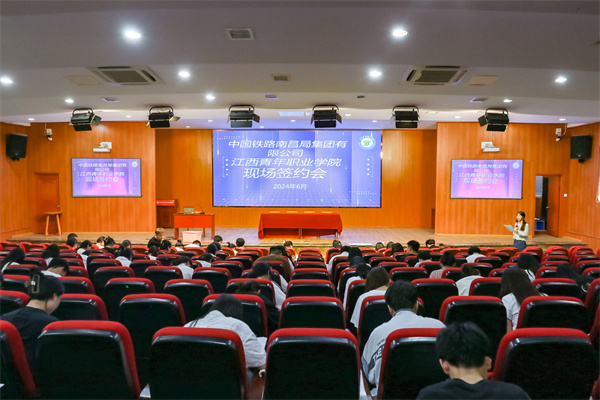 6月11日下午,中国铁路集团南昌客运段2024年新入职人员现场签约仪式在江西青年职业学院学术报告厅举行。南昌铁路局客运段职教科陆小花老师、省人力资源公司胡乙伟主任及学校招生就业处负责人欧阳晓山、交通管理系党总支副书记刘江海共同参加签约仪式。