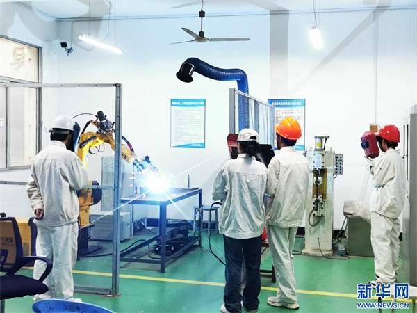 江西青年职业学院学生进行焊接机器人实操。新华网发