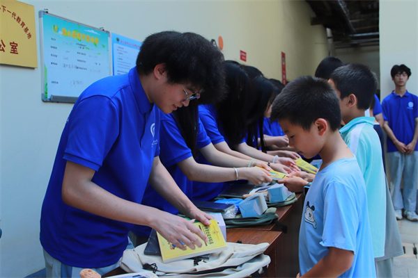 五育并举助成长。实践队积极组织了“羽球大赛”“益智游戏”“象棋对弈”等互动项目,在陪伴中向孩子们传递关爱与温暖,帮助他们建立自信并增强自我价值感。此外,队员们还与孩子们一起动手组装书包,并将精心挑选的学习和生活用品逐一放入其中。中华美德故事读本,帮助孩子们树立正确的价值观;笔袋和本子,鼓励他们探索知识的乐趣,激发创造力;跳绳和水杯,旨在培养孩子们的运动习惯,提高身体素质;彩色画笔,希望孩子们能够发现并记录生活中的美;毛巾则引导小朋友通过家务劳动锻炼能力、保持良好的生活习惯。通过整理“五育小书包”,我们期待更多的儿童能肩背“德智体美劳全面发展行囊”,昂首阔步迈向充满希望的未来。