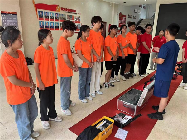 为深入了解消防工作的重要性,系统掌握消防基础知识和操作技能,切实提升防火防灾意识和自救自护能力,实践队前往青云谱区消防救援大队开展实地学习与体验活动。队员们认真学习了火警应急响应、高效逃生策略等重要知识,在消防救援大队的精心组织下,亲身体验了消防专业装备的穿戴与使用,从防护服的快速穿着到呼吸器的正确佩戴,每一步都力求精准无误。通过模拟训练,队员们学习了利用绳索高效爬楼的救援技巧,感受到消防员的无畏与伟大。在灭火器实操环节,经验丰富的消防员现场演示并指导队员们正确识别火源类型、选择适宜的灭火器,总结“提、拔、握、压”的灭火四步法,为应对初期火情打下坚实基础。
