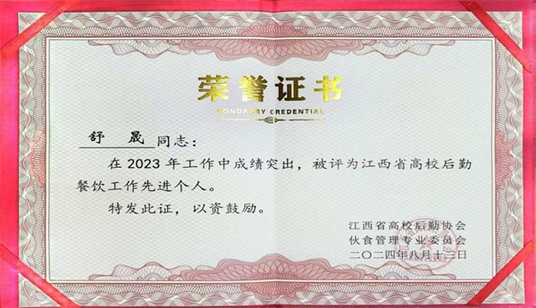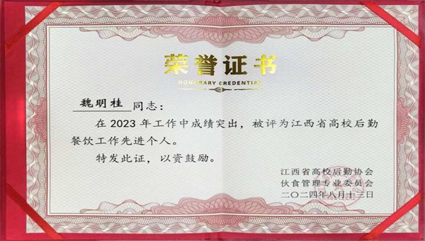近日,江西省高校后勤协会伙食管理专业委员会发布了《关于表彰2023年度江西省高校后勤餐饮管理工作先进单位和先进个人的决定》,江西青年职业学院荣获“2023年度江西省高校后勤餐饮管理工作先进单位”称号,学校后勤管理处舒晟、魏明桂荣获“2023年度江西省高校后勤餐饮工作先进个人”称号。