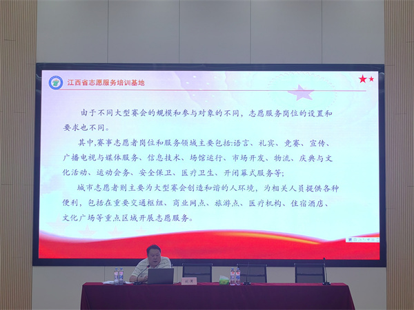 为提高志愿服务水平,学校团委副书记、江西省志愿服务培训基地讲师刘泽受邀为本次大会全体赛事志愿者作志愿服务岗前培训,内容包括赛会志愿服务实务、志愿服务沟通与表达技巧、应急处理等。