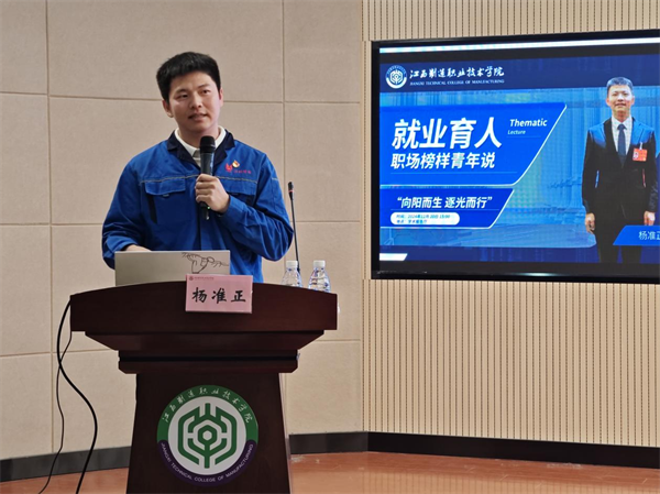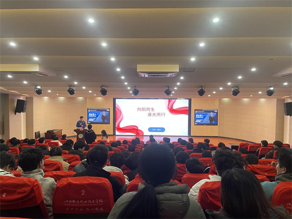 近日,“职业榜样青年说”就业育人主题讲座“向阳而生,逐光而行”在江西制造职业技术学院报告厅举行。团市委宣传部王震应邀出席,江铃股份智能装备中心全国五一劳动奖章获得者杨准正作为主讲嘉宾,旨在通过分享与交流,引导学生们树立正确的就业观念,激发学生对未来的热情与信心。学校招生就业处副处长曹新宇及200余名学生参加。