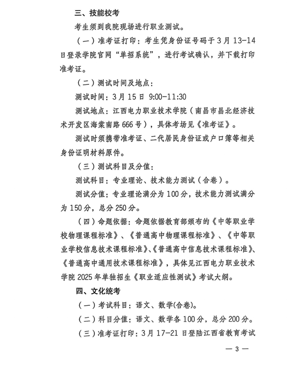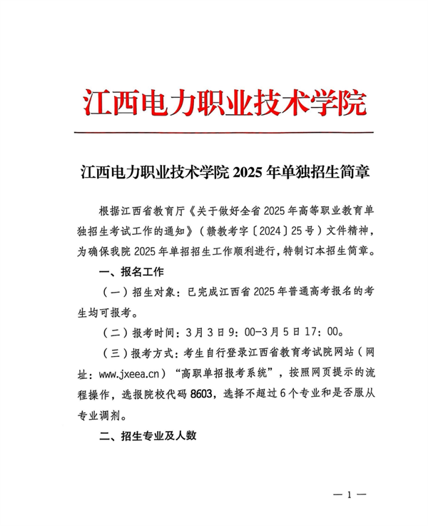 根据江西省教育厅《关于做好全省 2025 年高等职业教育单独招生考试工作的通知》(赣教考字〔2024〕25 号)文件精神,为确保学院2025年单招招生工作顺利进行,特制订本招生简章。
